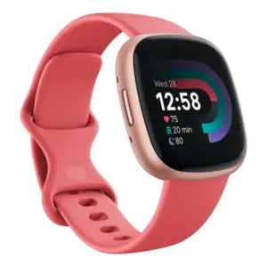 The Versa 4, a smartwatch with integrated smart technology, and a battery life of up to a week on a single charge. Comes in three colors, Black & Graphite, Pink Sand & Copper Rose, and Waterfall Blue & Platinum.